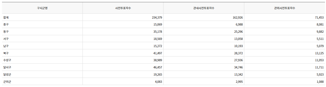 대구 중구 사전투표율 대구 동구 사전투표율 대구 서구 사전투표율 대구 남구 사전투표율 대구 북구 사전투표율 대구 수성구 사전투표율 대구 달서구 사전투표율 대구 달성군 사전투표율 대구 군위군 사전투표율