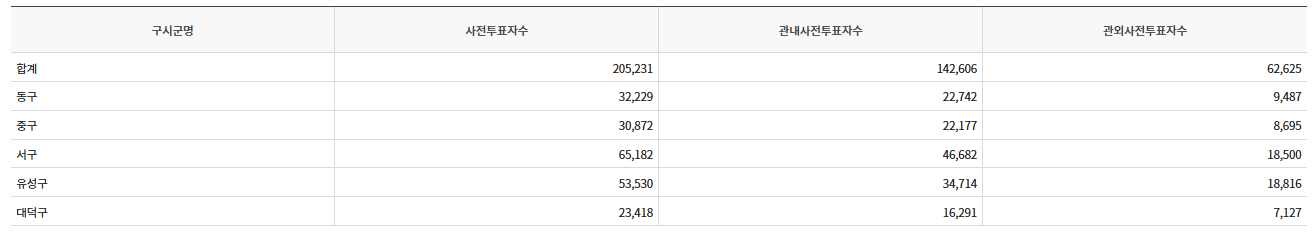대전 동구 사전투표율 대전 중구 사전투표율 대전 서구 사전투표율 대전 유성구 사전투표율 대전 대덕구 사전투표율