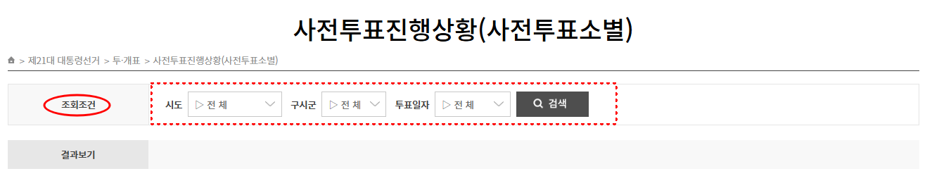 ※ 조회조건에서 시도별, 구시군, 투표일자 선택하여 검색
